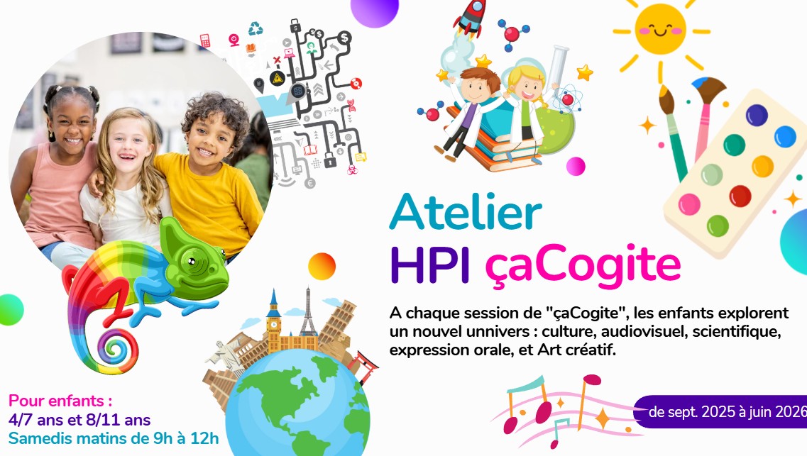 çaCogite est l'atelier "phare" pour les jeunes hpi Une aventure intellectuelle à chaque fois ! Chaque session s'étend sur une période, comprise entre deux vacances scolaires (envrion 6 à 7 semaine), ce qui permet d'aborder plusieur univers sur l'année : Scientifique, culturel, créatif, numérique, expression orale pour stimuler leur curiosité (possibilité de s'inscrie à une sessions ou à plusieurs). Tout en favorisant l'émulation intellectuelle entre pairs, l'épanouissement personnel et l'estime de soi, cet atelier hebdomadaire va contribuer à remerdier aux difficultés d'intégration sociale et scolaire, aux difficultés de gestion des émotions et de la frustration, à l'agitation motrice et intellectuelle. Autant de situations qui peuvent influencer le caractère de l'enfant, influer sur sa scolarité et déstabiliser la sphère familiale. L'atelier est utilisé comme support éducatif, pédagogique et thérapeutique. Les enfants petit à petit vont s'illuminer et réinvestir les compétences mobilisée (habilité sociale, autonomie, gestion des émotions, concience corporelle, expression orale...) dans d'autres contextes. :-) |